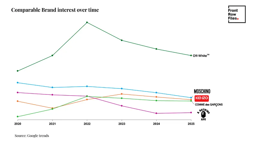 Kenzo holds steady at the lower end of brand interest, far below fellow street wear brand, Off-White’s cultural spike. Yet even Off-White which was divested by LVMH in 2024